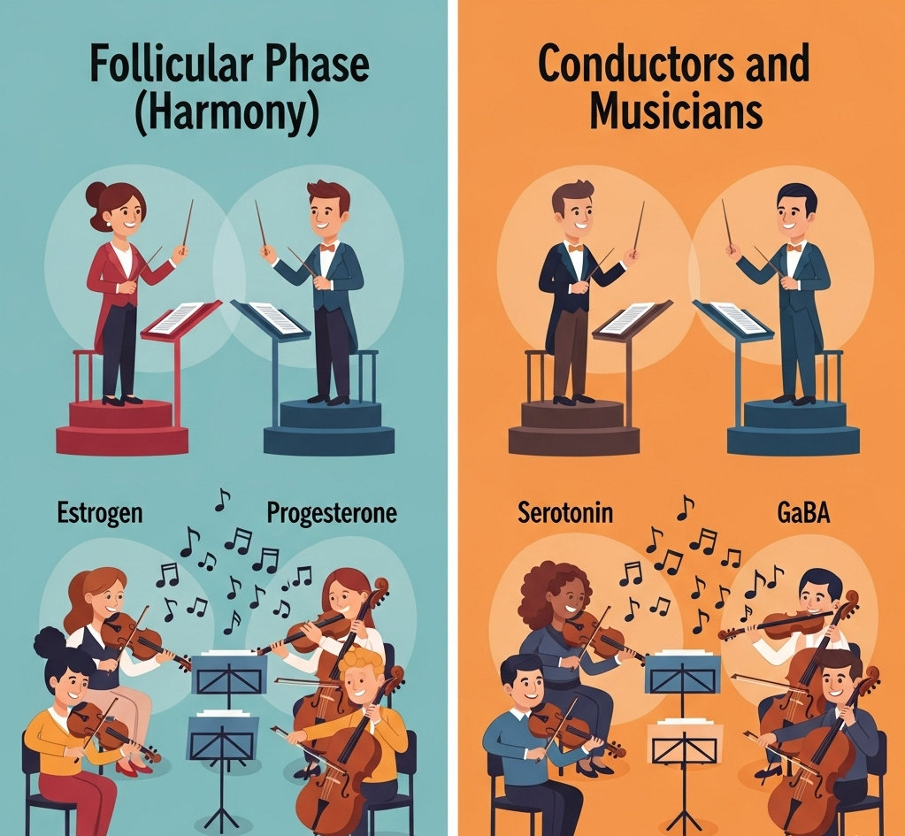 Wyobraź sobie, że te hormony nie działają tylko na macicę i jajniki. One są jak dyrygenci potężnej orkiestry neuroprzekaźników w Twoim mózgu. Dopóki stoją na podium i machają batutą, wszystko gra w harmonii. Ale kiedy nagle schodzą ze sceny, w orkiestrze zaczyna panować chaos. Dwóch kluczowych muzyków – Serotonina i GABA – zaczyna wtedy grać zupełnie bez ładu i składu.