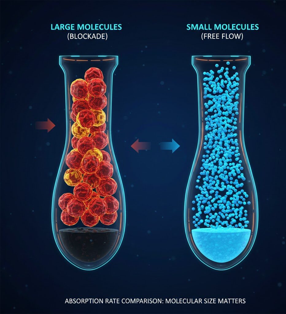 Różnica między standardowym kwasem a naszym 1000 Da jest jak różnica między próbą przepchnięcia głazu przez dziurkę od klucza a swobodnym przepływem piasku.