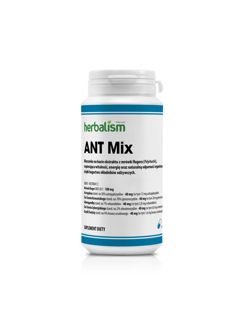 Ekstrakt z Mrówek Roger DER 20:1 – 100 mg; Ekstrakt z korzenia Astragalusa (Astragalus membranaceus) standaryzowany na 30% astragalozydów – 40 mg (w tym 12 mg astragalozydów); Ekstrakt z korzenia Żeń-szenia Koreańskiego (Panax ginseng) standaryzowany na 70% ginsenozydów – 40 mg (w tym 28 mg ginsenozydów); Ekstrakt z korzenia Ashwagandhy (Withania somnifera) standaryzowany na 7% witanolidów – 40 mg (w tym 2,8 mg witanolidów); Ekstrakt z korzenia Żeń-Szenia Syberyjskiego (Eleutherococcus senticosus) standaryzowany na 2% eleuterozydów – 40 mg (w tym 0,8 mg eleuterozydów); Ekstrakt z liści Bazylii Świętej (Ocimum sanctum) standaryzowany na 4% kwasu ursolowego – 40 mg (w tym 1,6 mg kwasu ursolowego).