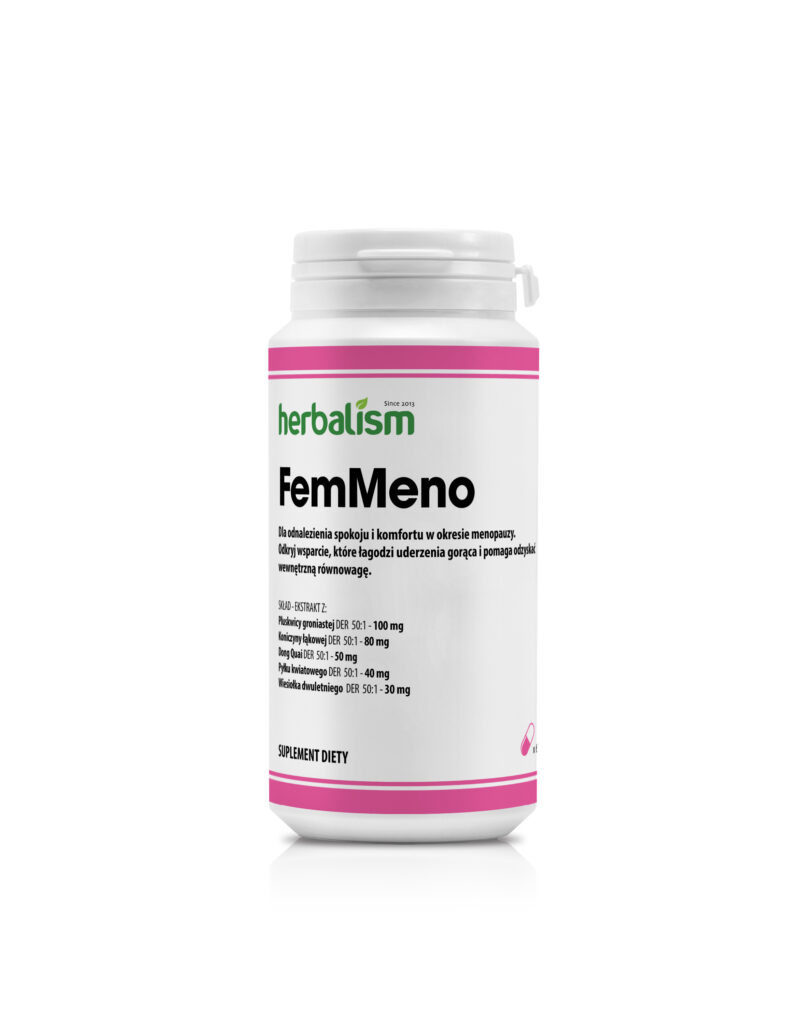 Uderzenia gorąca i wahania nastroju odbierają Ci radość życia? FemMeno to synergiczny kompleks 5 skoncentrowanych ekstraktów roślinnych (DER 50:1), zaprojektowany, by skutecznie łagodzić uderzenia gorąca, poprawiać jakość snu i wspierać równowagę emocjonalną. To Twoja codzienna tarcza w komfortowym przejściu przez okres menopauzy.