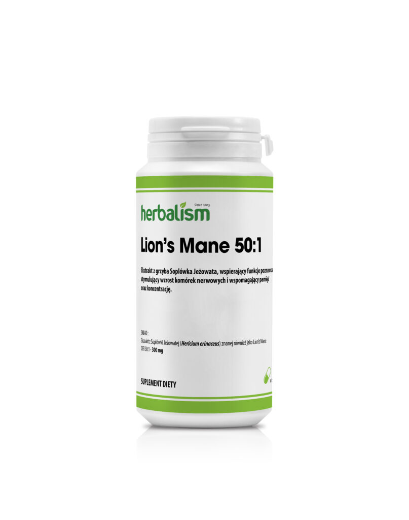 Ekstrakt z owocników Lion’s Mane (Hericium erinaceus) DER 50:1 – 300 mg.