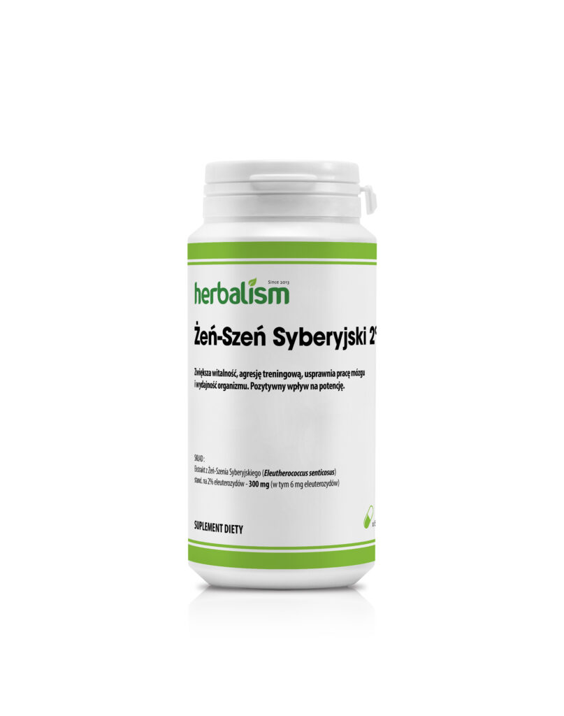 Ekstrakt z korzenia Żeń-Szenia Syberyjskiego (Eleutherococcus senticosus) standaryzowany na 2% eleuterozydów – 300 mg (w tym 6 mg eleuterozydów).